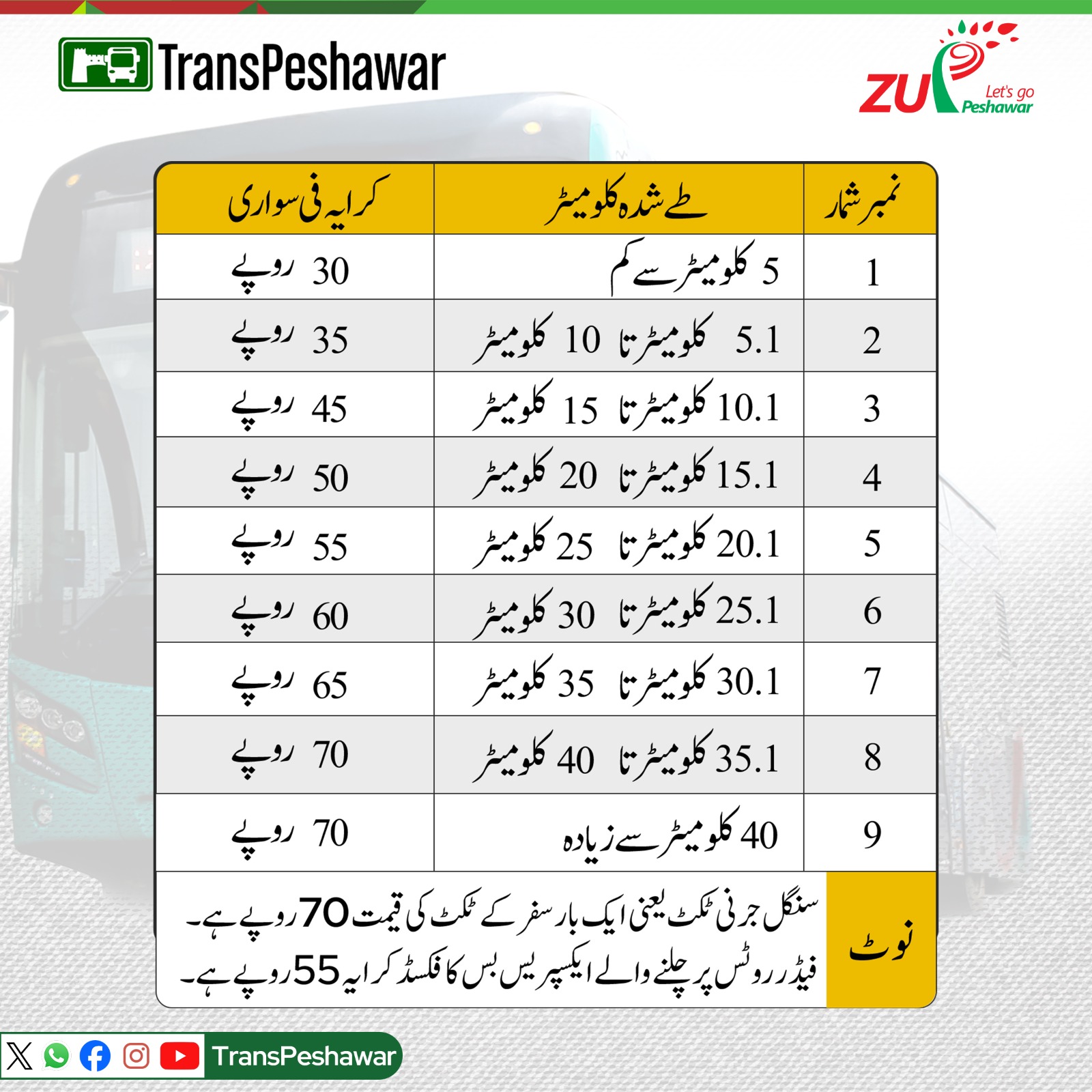 The Khyber Pakhtunkhwa Urban Mobility Authority (KPUMA) has issued a notification announcing an increase in BRT fares. According to the notification, a Rs. 10 increase has made in all stages of BRT fare.