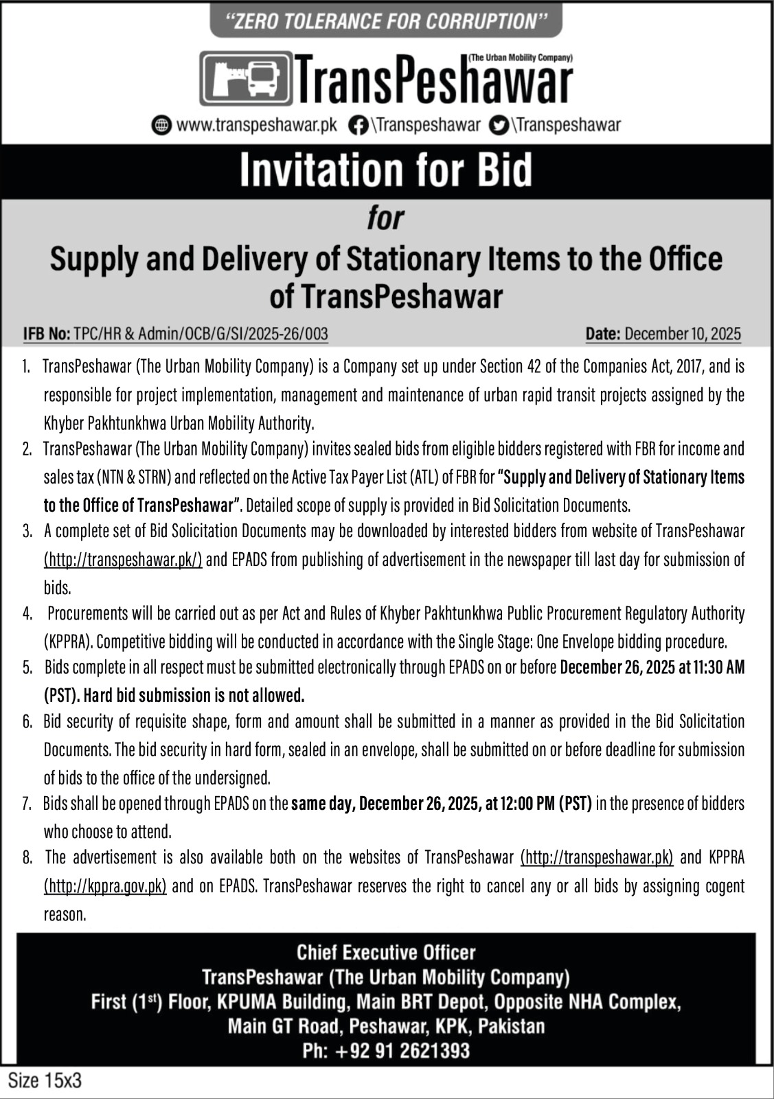 Supply and Delivery of Stationery Items to the Office of TransPeshawar