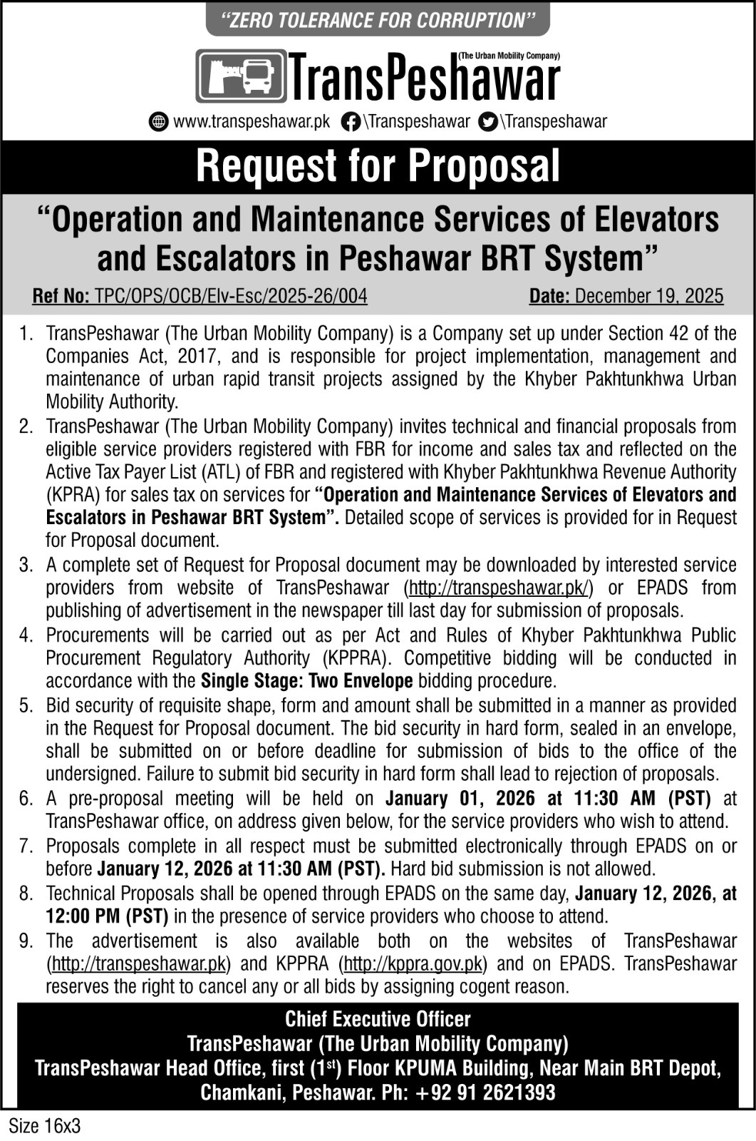 Request for Proposal for Vehicle Operation and Maintenance Services for Peshawar Sustainable Bus Rapid Transit Corridor – Hayatabad Depot