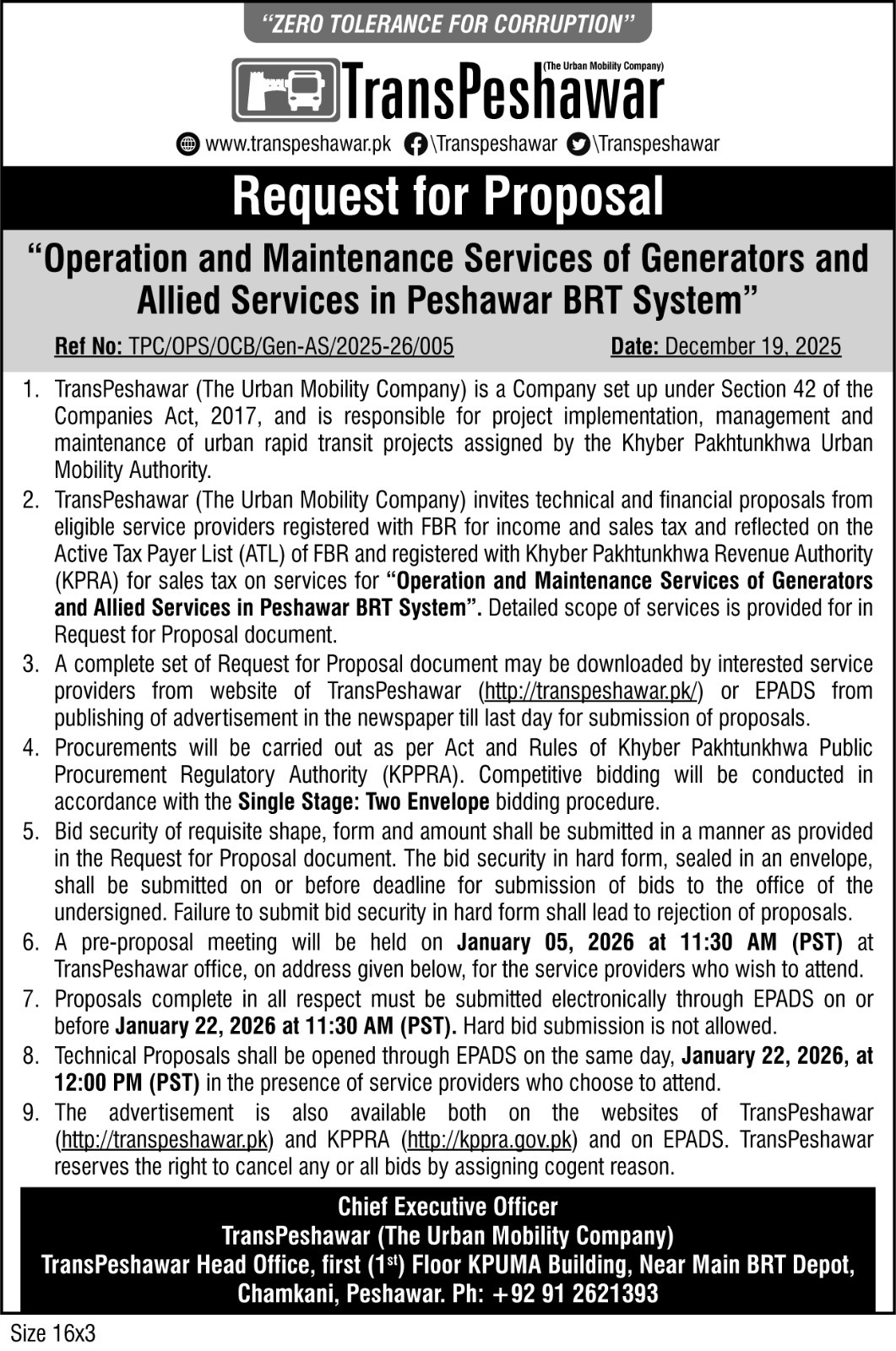 Operation and Maintenance Services of Generators and Allied Services in Peshawar BRT System