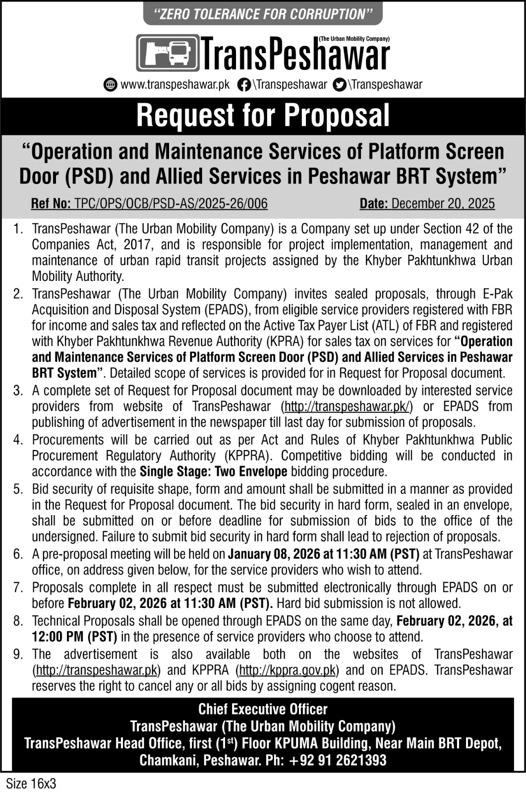 Operation and Maintenance Services of Platform Screen Door (PSD) and Allied Services in Peshawar BRT System