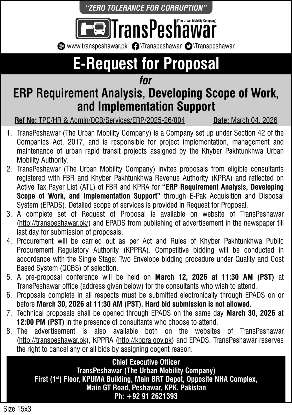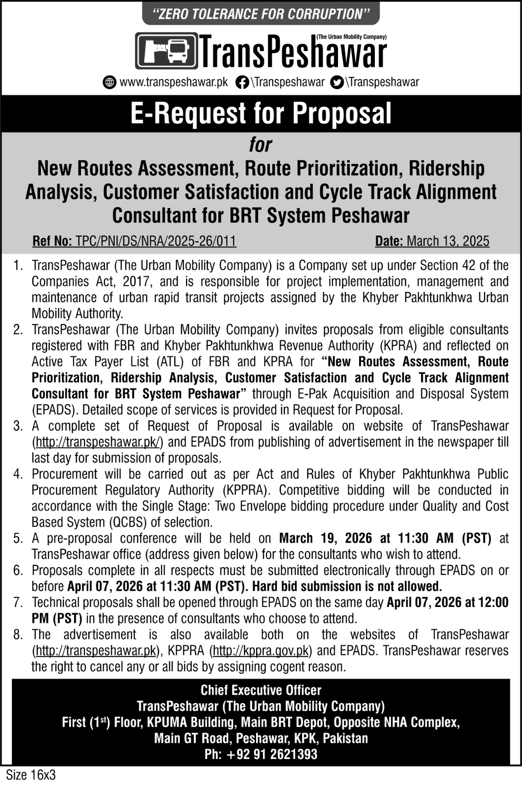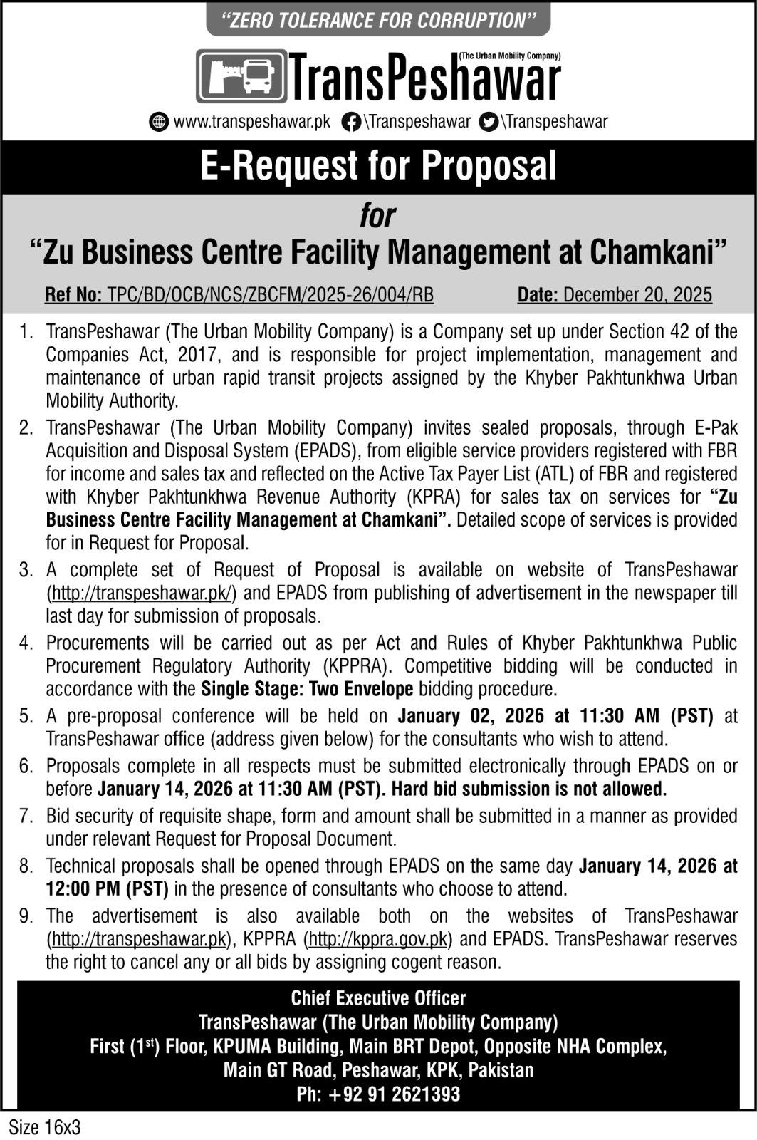E-Request for Proposal for Tax Exemption Advisory Services for TransPeshawar