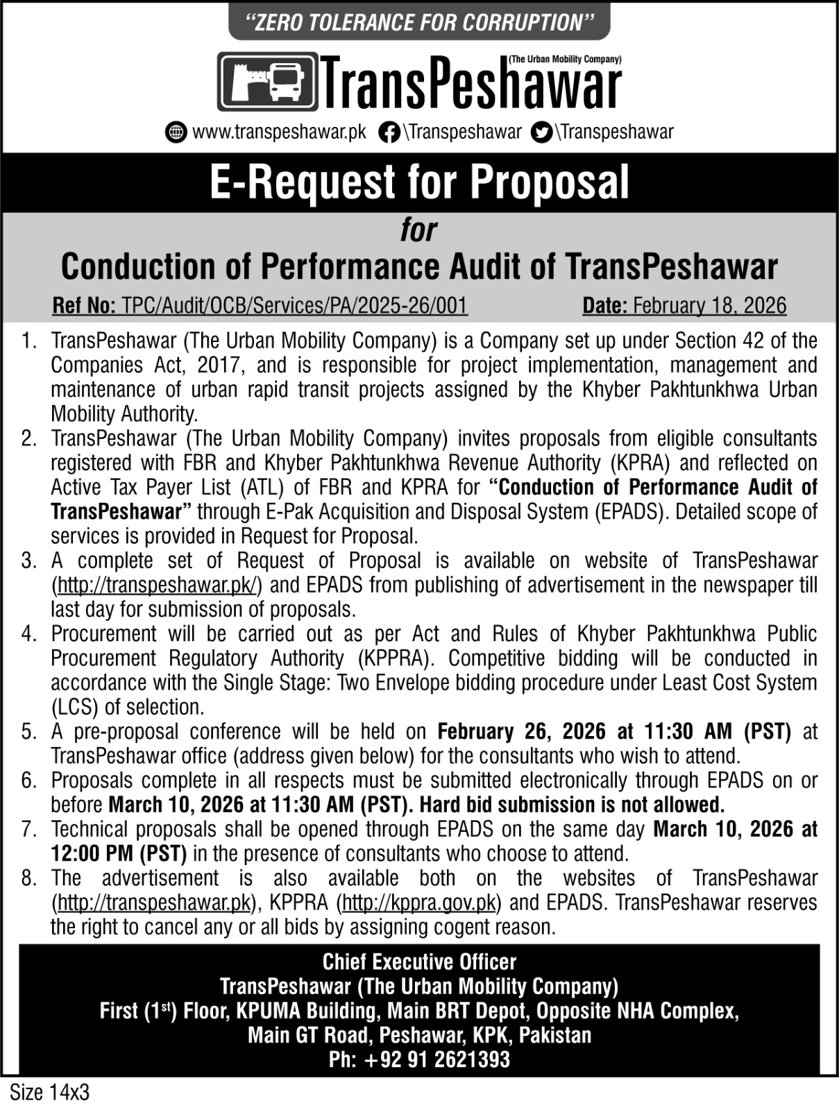 Hiring of External Auditor for TransPeshawar