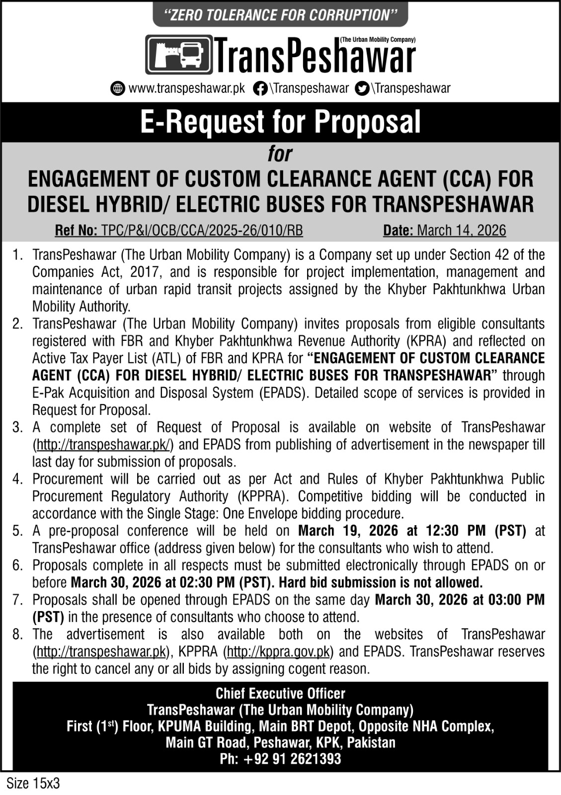 Engagement of Custom Clearance Agent (CCA) For Diesel Hybrid/ Electric Buses For TransPeshawar