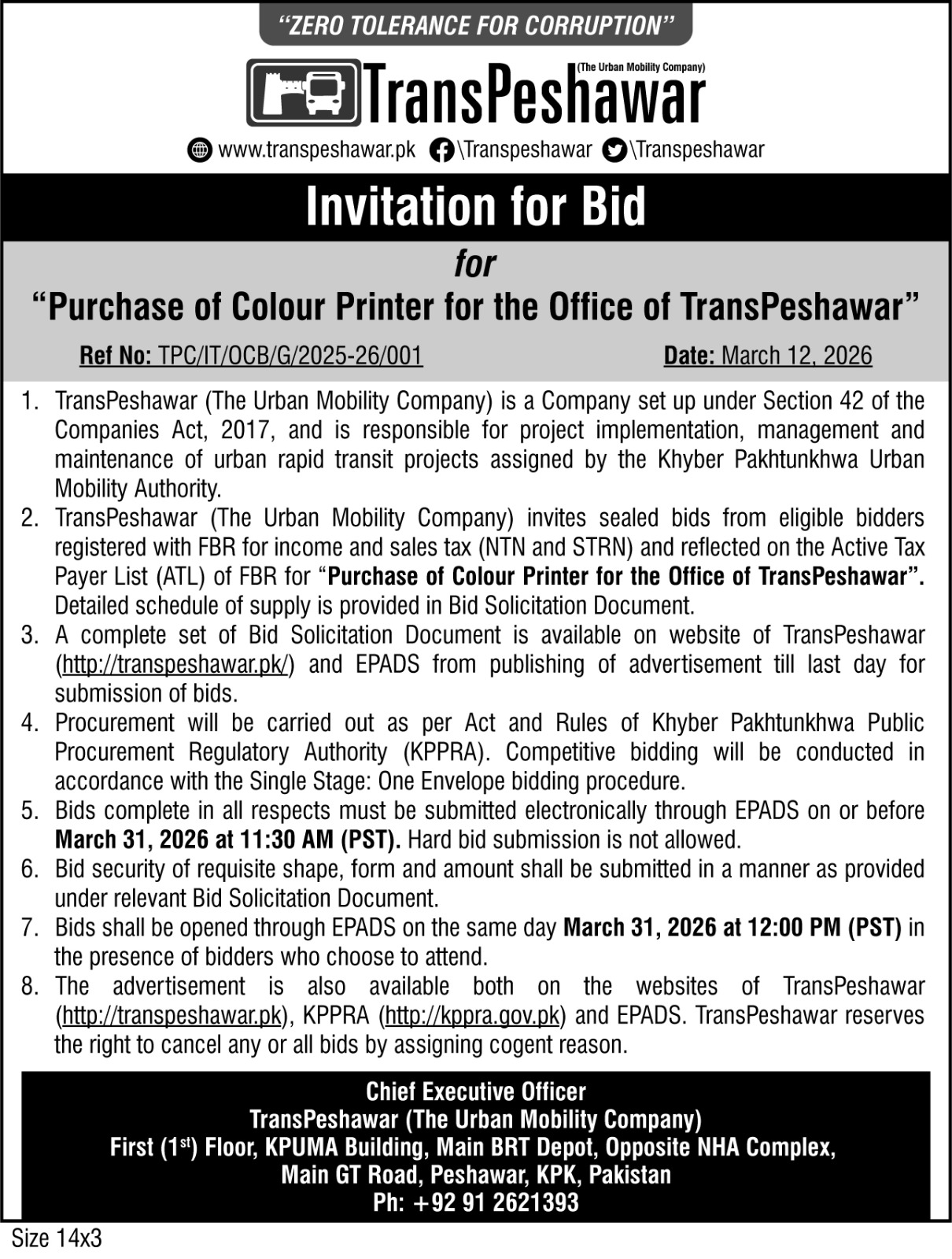 Purchase of Colour Printer for the Office of TransPeshawar
